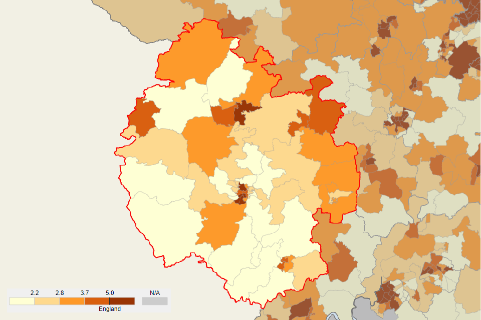Looking at a small area level gives a more detailed picture of how unemployment varies across a county. For example, the county of Herefordshire as a whole has a low unemployment rate of 3.1%. However, the rates for wards within this area vary between 1.6% and 5.9%. Using Local Health to highlight within area inequalities (Figure 4) allows for targeted action in the areas that have most need.
