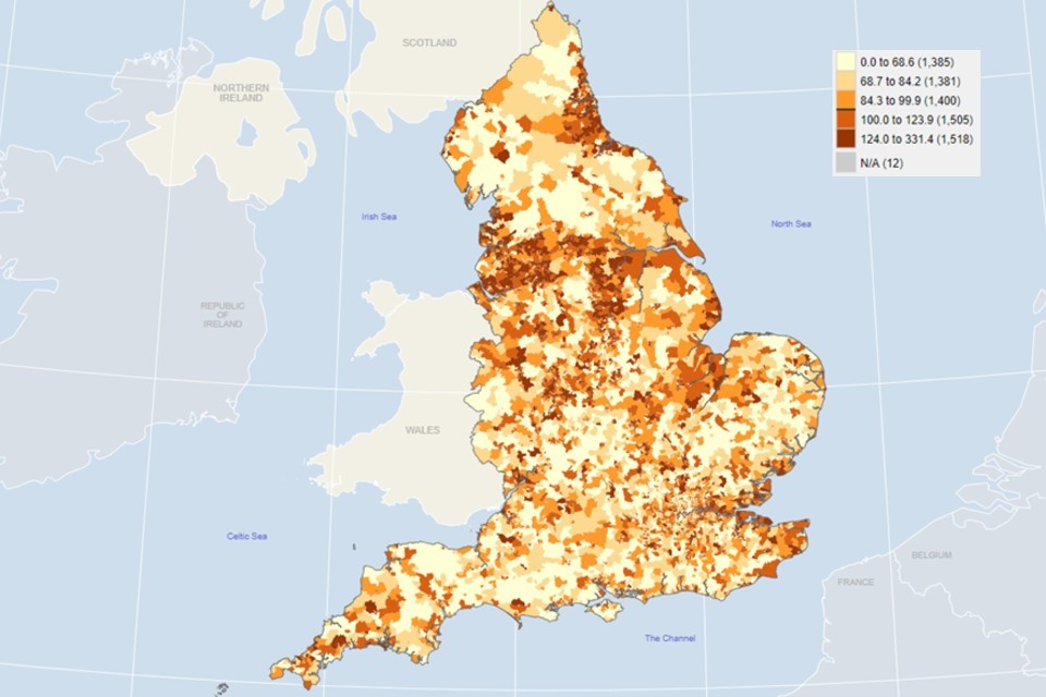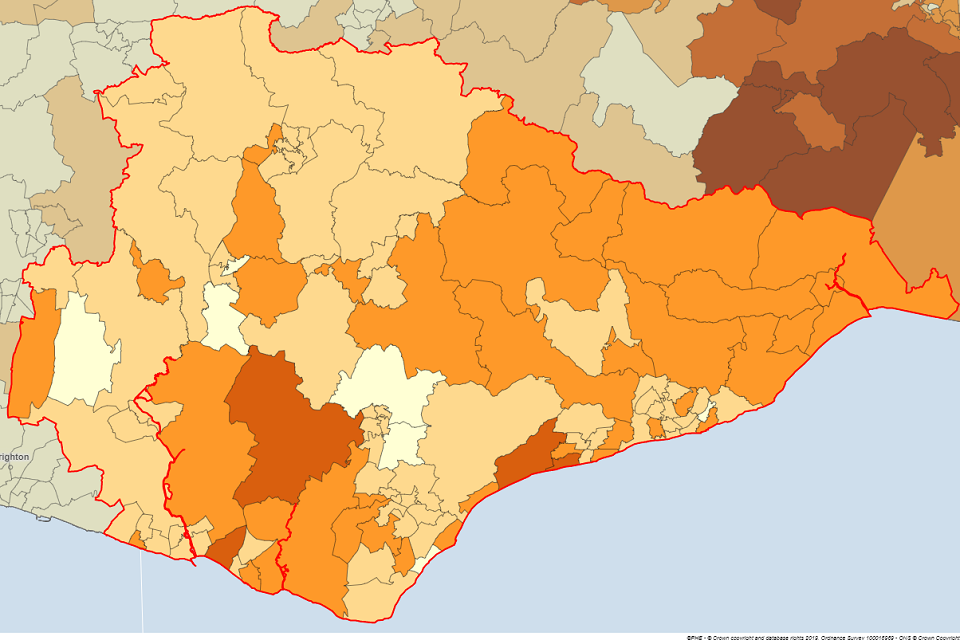 The image below shows the wards within the upper tier local authority (UTLA) of East Sussex. The UTLA area falls within quintile 3 for all UTLAs in England. However, when you drill down into the 108 electoral wards which form the UTLA you can see that the UTLA contains areas that fall within a range of quintiles.