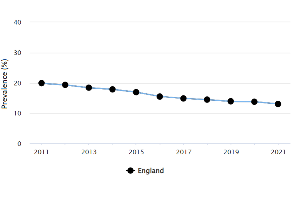 The current adult (18+) smoking prevalence figure for 2021 in England was 13.0%. This a reduction from 13.8% in 2020 and continues the general downward trend observed since 2011 (19.8%). In 2021, 14.9% of men smoked compared with 11.2% of women in England. This trend has been consistent since 2011. The prevalence of ex-smoking among adults (18+) in 2021 was (25.7%) and of those who have never smoked was (61.3%).