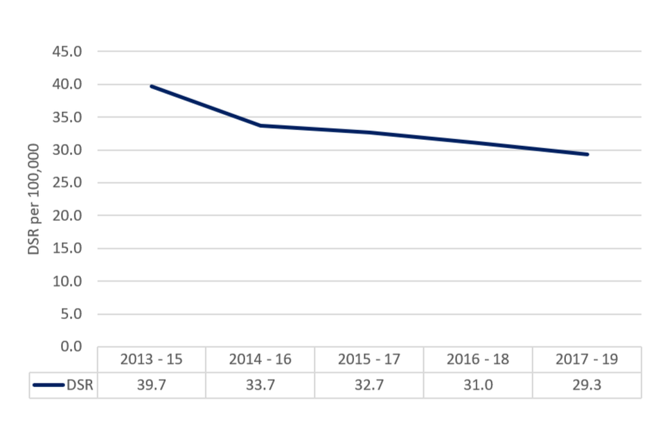 The rate of deaths attributable to smoking has decreased from 244.2 (per 100,000) in 2013 to 2015 to 202.2 (per 100,000) in the latest 3 year period (2017 to 2019).