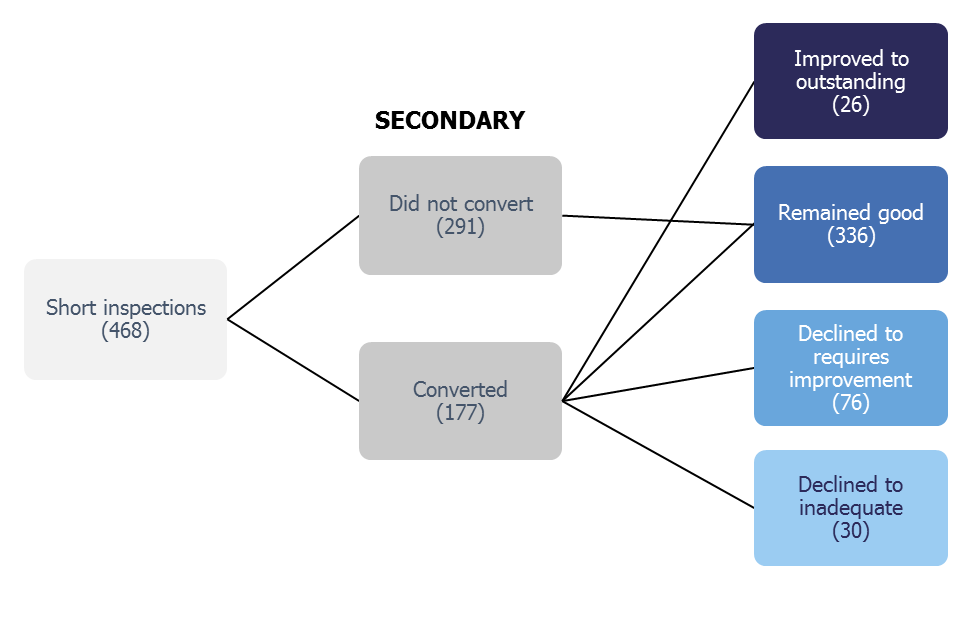 There were 468 short inspections of secondary schools, of which 177 converted to full inspections. In all, 336 schools remained good, 26 improved to outstanding, 76 declined to requires improvement and 30 to inadequate