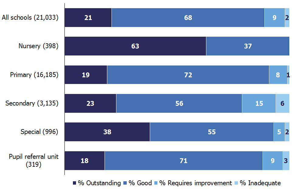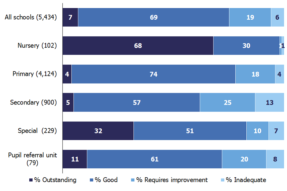 Seventy-five per cent of schools were judged good or outstanding this year. The proportion is higher for schools with younger pupils: 98% for nursery schools and 78% for primary schools, compared with 62% for secondary schools. A higher proportion of secondary schools were judged to be inadequate: 13% compared with 4% of primary schools and 1% of nursery schools.
