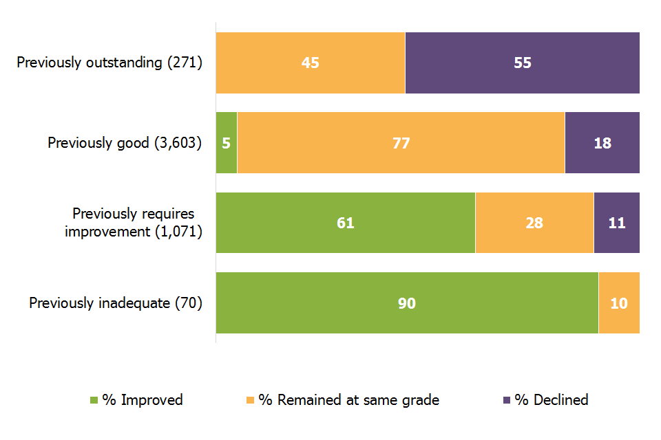 Ofsted is still able to inspect outstanding primary and secondary schools if their performance gives cause for concern. We have inspected 141 of these schools this year. Where the inspection became a full inspection, only 2 schools kept their outstanding grade, 63 declined to good, 43 declined to requires improvement and 19 to inadequate. The remaining 14 schools did not have a full inspection and remained outstanding. Overall 89% of the schools declined from their previous outstanding grade. However this is not surprising because most of the exempt schools inspected were those whose performance appeared to be declining[footnote 6].