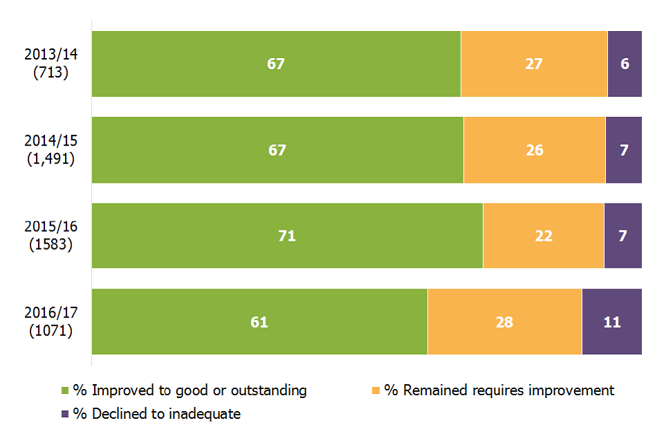 61% of schools judged to require improvement at their previous inspection improved to good or outstanding at inspections between September 2016 and August 2017, compared to 71% in the previous year