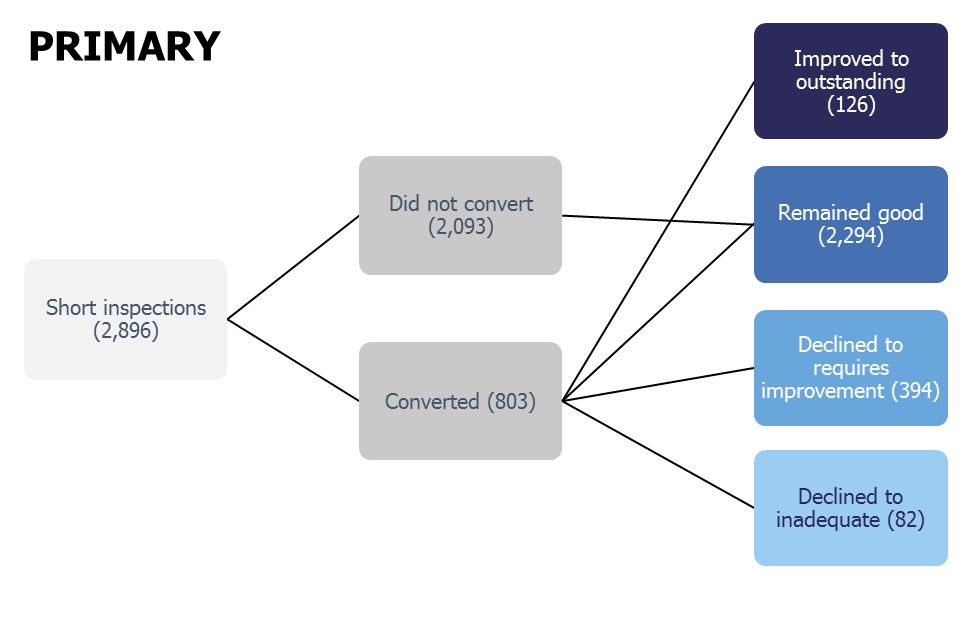 There were 2,896 short inspections of primary schools, of which 803 converted to full inspections. In all, 2,294 schools remained good, 126 improved to outstanding, 394 declined to requires improvement and 82 to inadequate