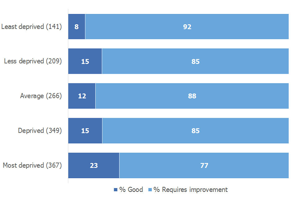Schools judged to require imrovement for overall effectivess were all judged good or to require improvement for leadership and management. More were judged good in the most deprived areas than the least; 23% compared to 8%