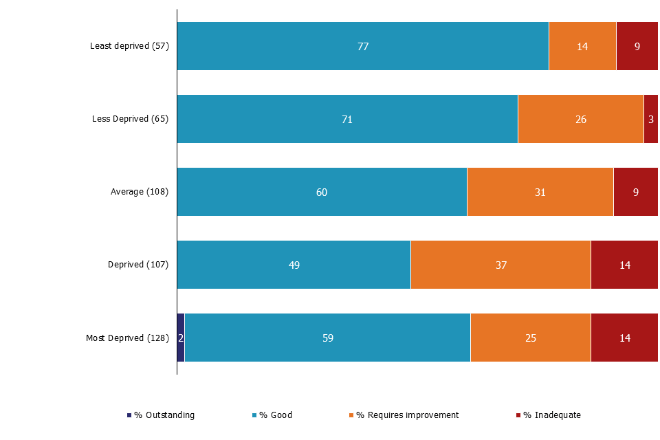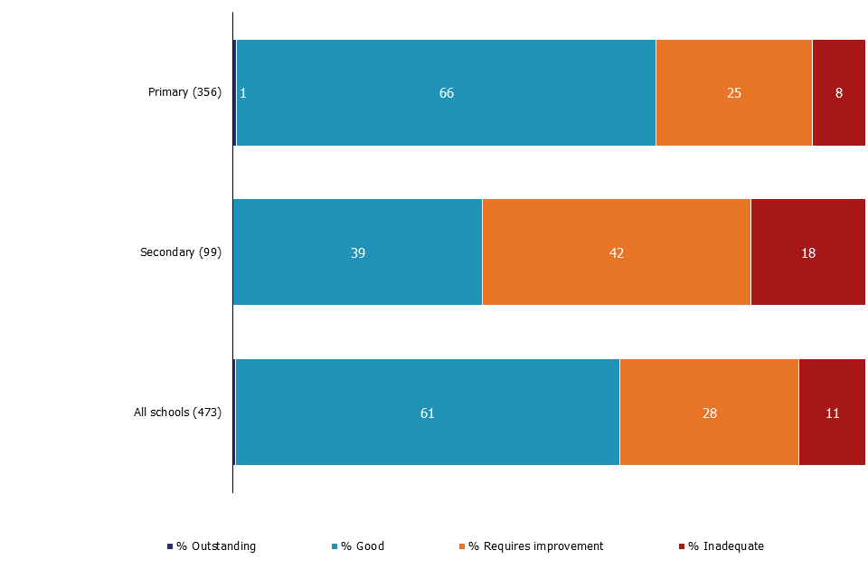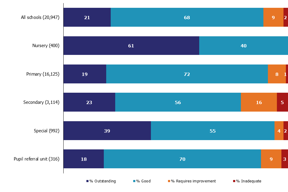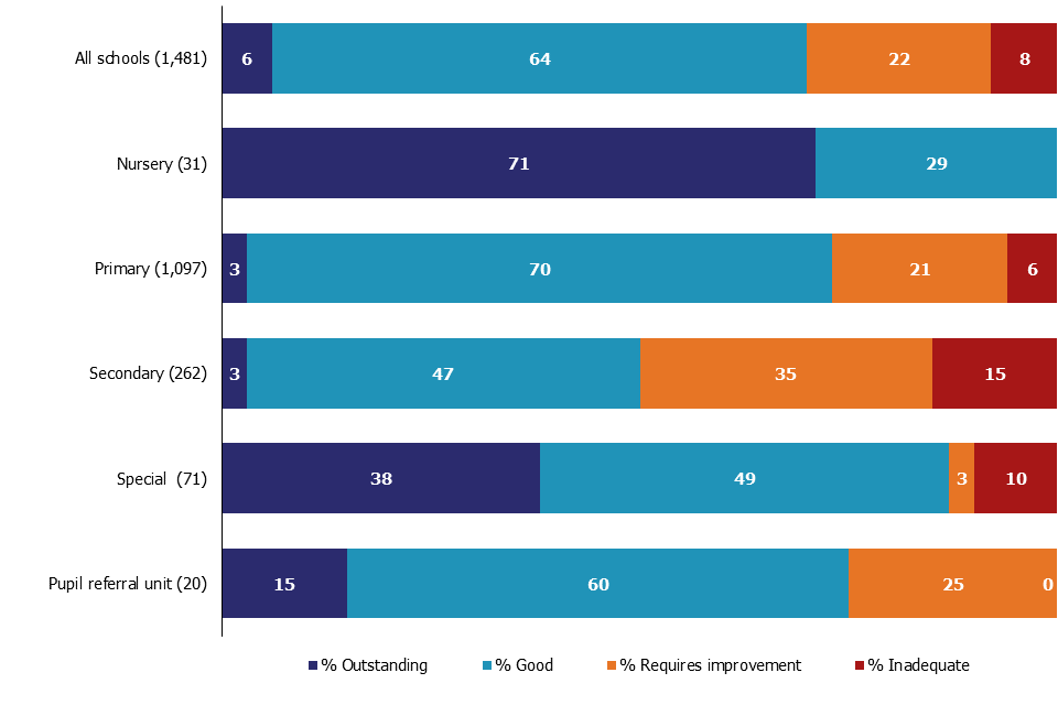 For primary schools the proportion of good schools increased from 71% to 72%, while the proportion of schools judged to require improvement decreased from 9% to 8%. For secondary schools the proportion judged to be outstanding has increased from 22% to 23%, while the proportion judged to require improvement has decreased from 17% to 16%. All 400 nursery schools are now judged to be good or outstanding following the recent closure of one school that had been judged to require improvement.