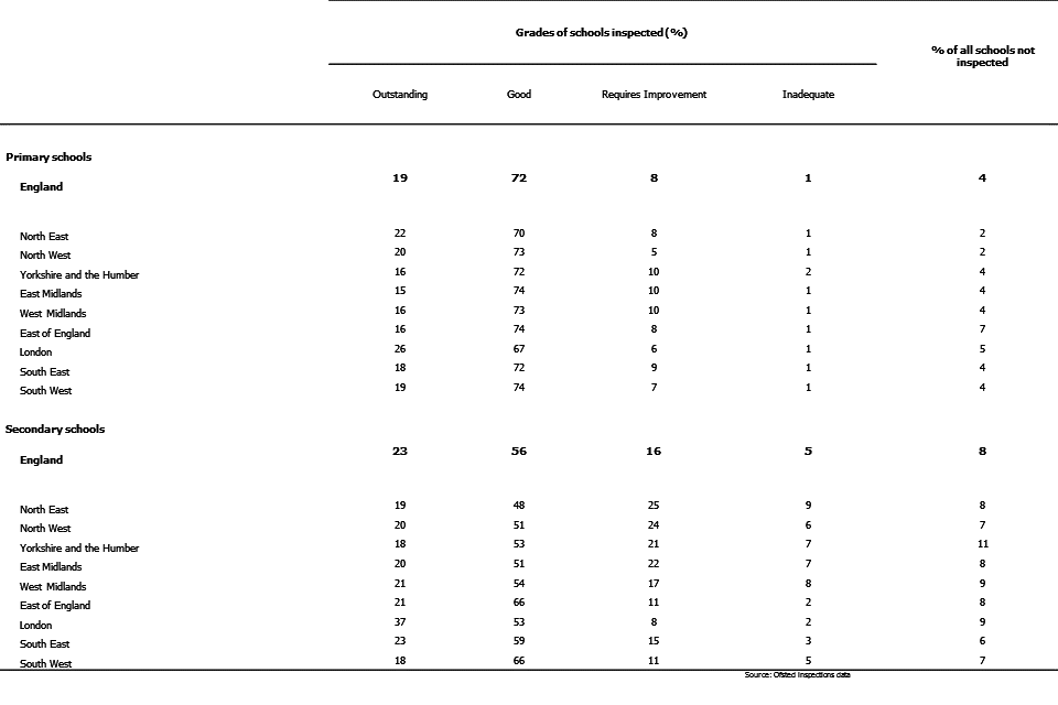 London has the highest proportion of outstanding schools for both the primary and secondary phases (26% and 37% respectively). Yorkshire and the Humber has the highest proportion of inadequate primary schools (2%) and the North East has the highest proportion of inadequate secondary schools (9%). See table 1.