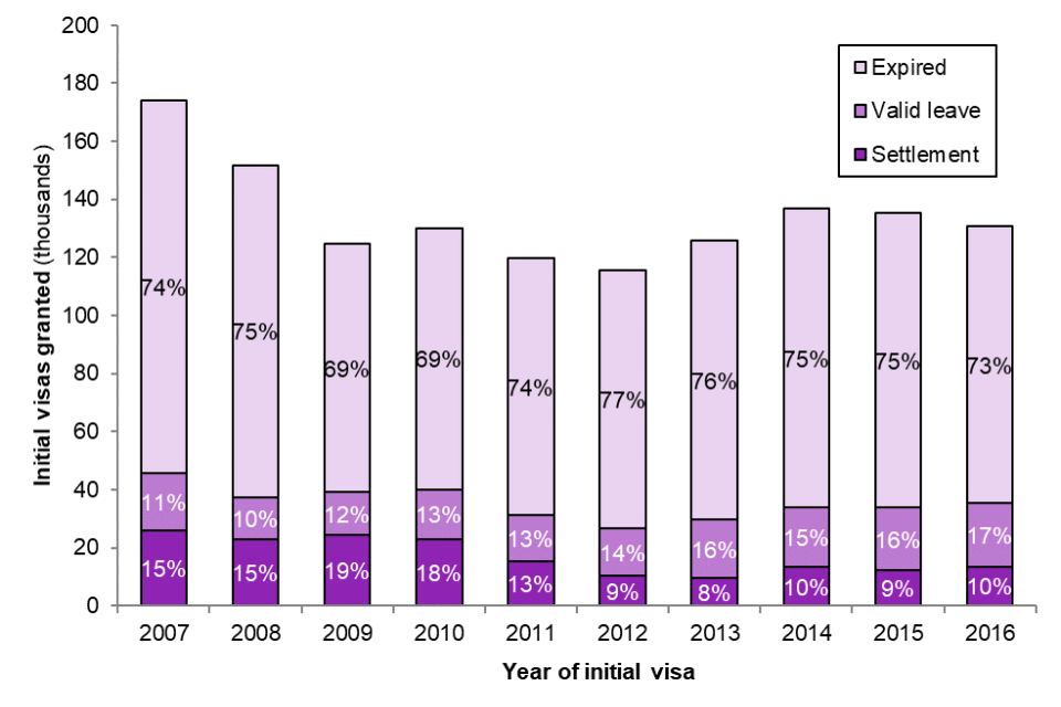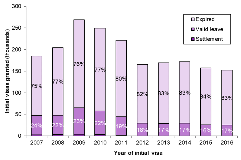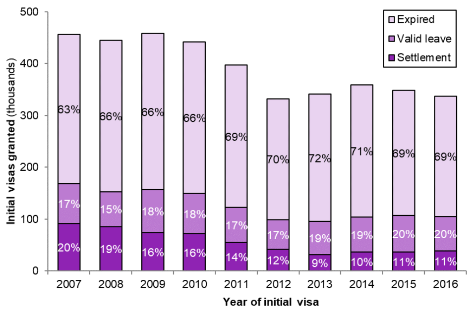 In 2016, around 337,000 people were initially granted leave within the main categories. Of these, 38,000 (11%) had been granted settlement by the end of 2021 and a further 67,000 (20%) still held valid leave.
