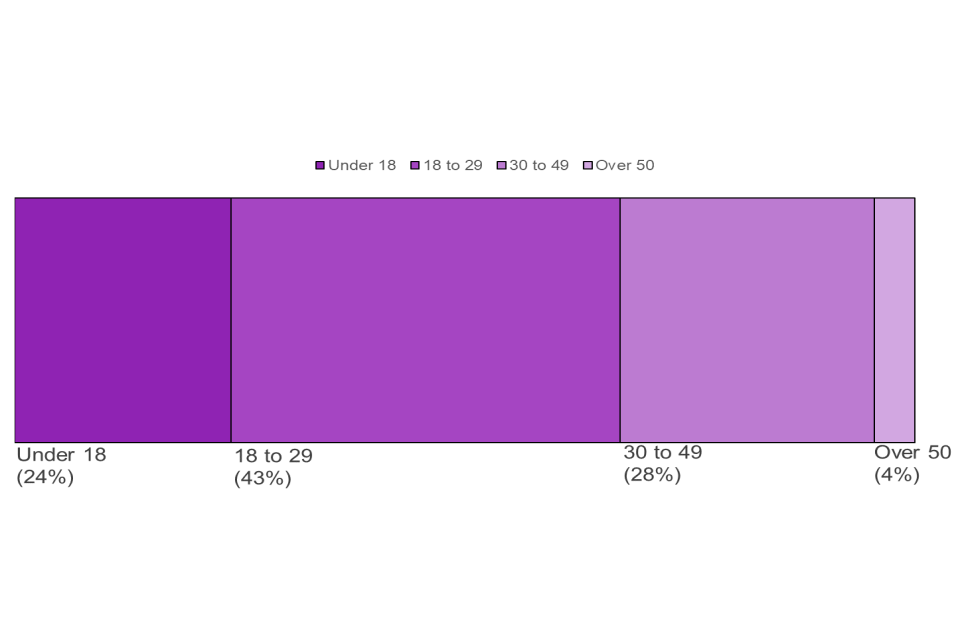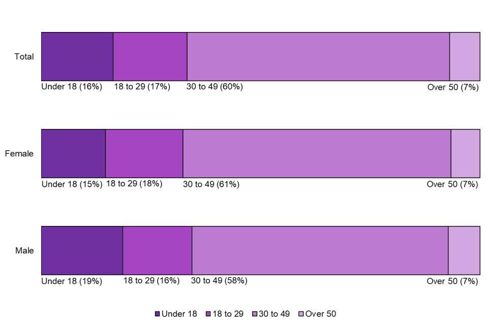 Of all those granted settlement in 2021, a majority (60%) were between 30 and 49 years old, just less than a fifth (17%) were aged 18 to 29, 16% were under 18, and 7% were over 50. These proportions are shown in figure 6.