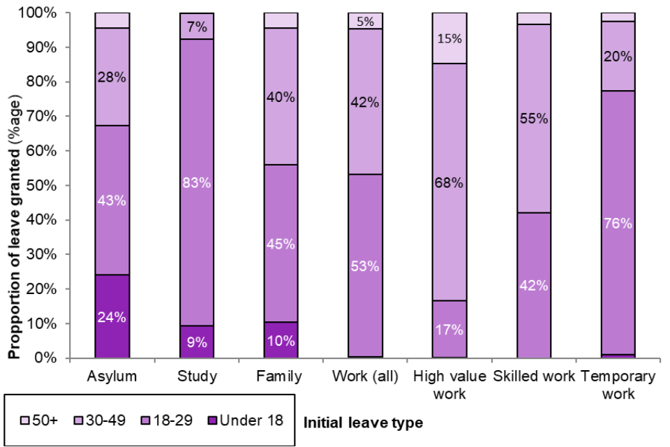 Percentages on the left do not sum to 100% as the initial categories of ‘Dependants joining or accompanying’ and ‘Asylum’ are excluded from the chart.