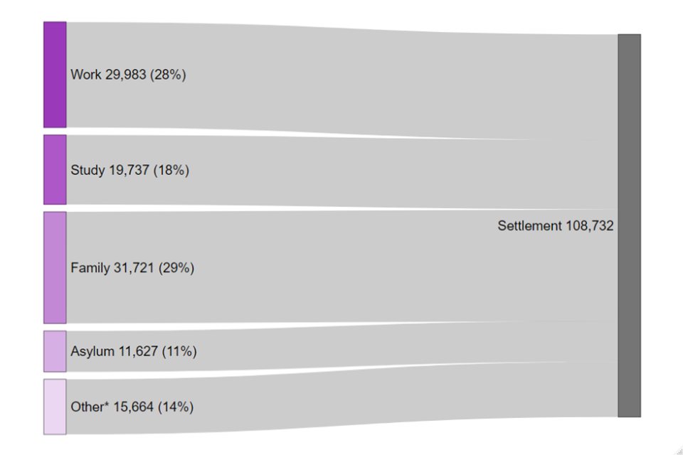 Figure 4 shows that of the 109,000 people granted settlement in 2021, a little over a quarter had initially come for Family (29%), a similar proportion for Work (28%) reasons, just under a fifth (18%) came to study, around one in nine (11%) were recorded as having been refugees and the remainder (14%) came for other reasons.