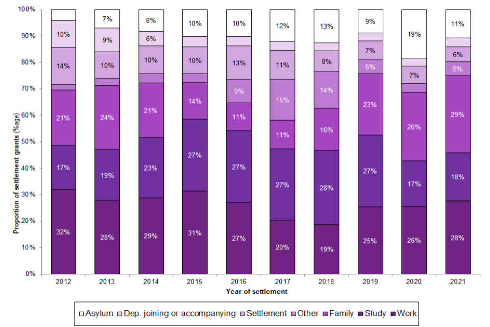 Figure 5 shows the proportions of initial leave category of people granted settlement in each year from 2012 to 2021.
