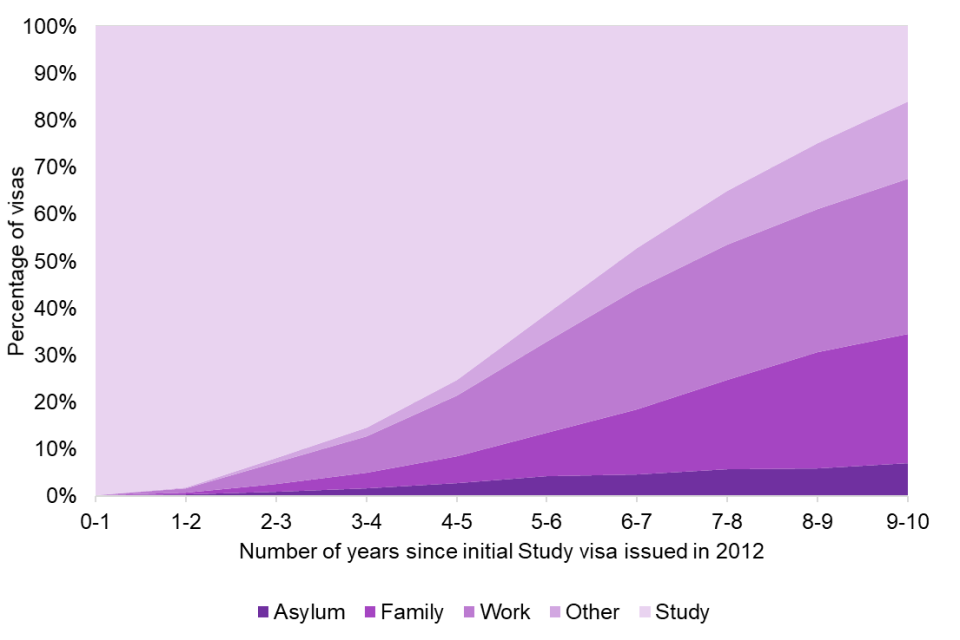 The Sponsored study figures exclude Short-term study (where visas are valid for up to 6 or 11 months), as this category of leave cannot be extended in-country.