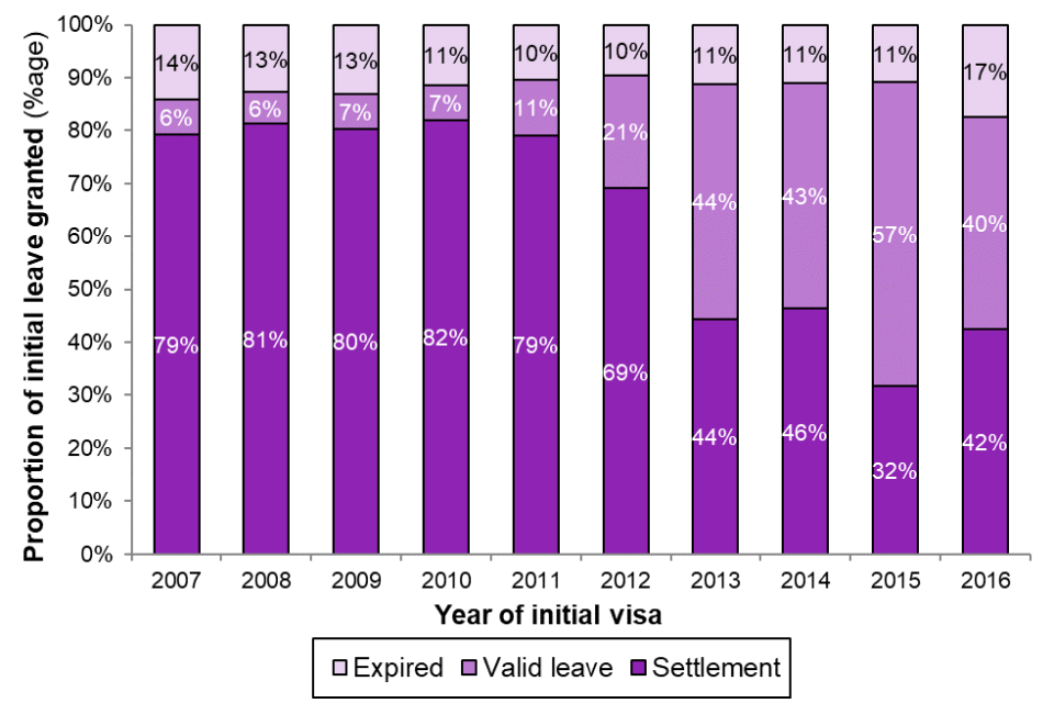 Figure 1 shows a decrease in the number of grants of initial leave from 2011, and then levelling off from 2012. The proportion of people who had been granted settlement five years after their initial visa decreased, from 20% in the 2007-08 cohorts to 9% in 2013 and has remained relatively stable since – 11% in 2016.