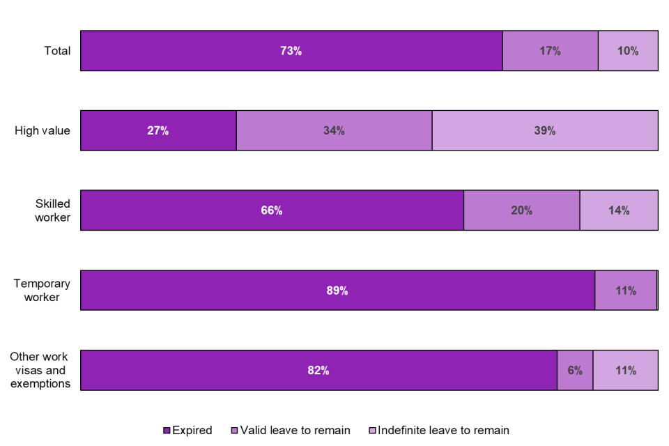 Of the 131,000 people initially granted a Work visa in 2016, just over a quarter (27%) still held valid leave or settlement at the end of 2021. However, the propensity to remain varied by route: