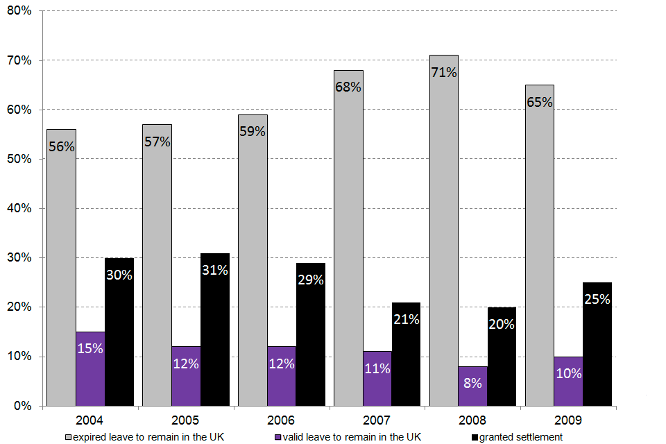 For people issued a dependants joining or accompanying visa in 2009, almost half (46%) had gained settlement (permission to stay permanently in the UK) 5 years later, and a further 7% still had valid leave to remain in the UK.