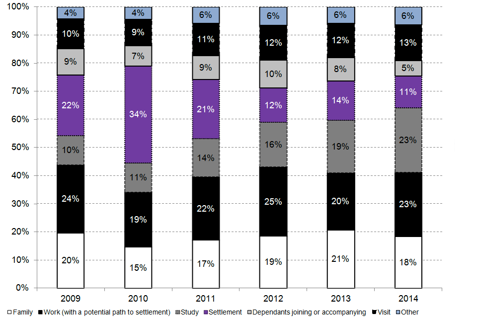 Around a quarter (23%) of those granted settlement in 2014 originally arrived to study, or had accompanied a student. This proportion has increased from 10% of those granted settlement in 2009. As this is a temporary route, these student migrants will, in most cases, have subsequently switched into a route to permanent settlement.
