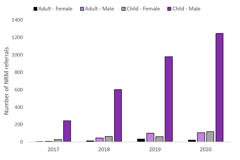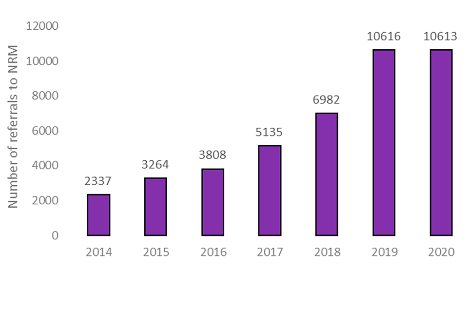 In 2020, 10,613 potential victims of modern slavery were referred to the NRM; a similar number to 2019. The plateau in referral numbers is primarily thought to result from the COVID-19 pandemic and associated restrictions.