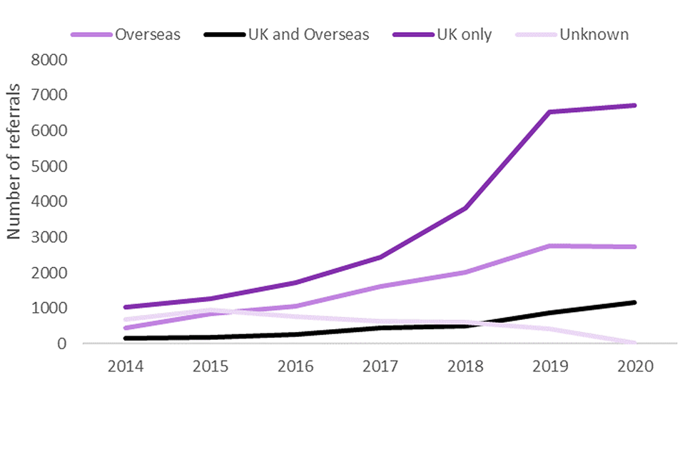 Figure 2: Number of annual NRM referrals by location of exploitation, 2014 to 2020