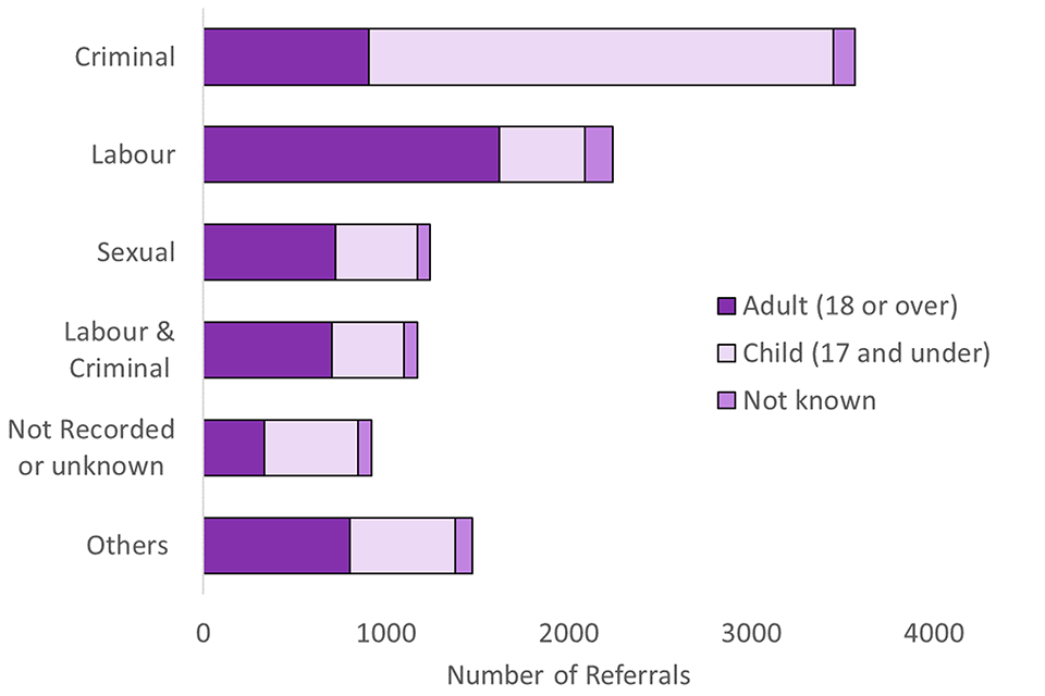 Overall, potential victims were most commonly referred for criminal exploitation only, which accounted for 34% (3,568) of all referrals (Figure 3). An additional 15% (1,590) of referrals stated that potential victims had been referred for criminal exploitation combined with other exploitation types (primarily labour). Criminal exploitation was most common for child potential victims (51%; 2,544), and the majority (93%; 2,362) of those were male.