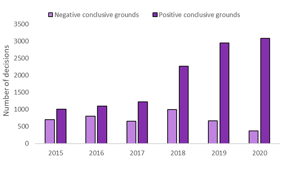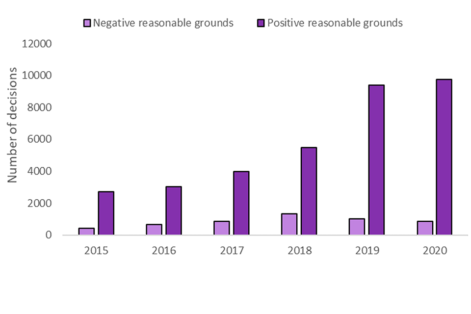 The Single Competent Authority made 10,608 reasonable grounds and 3,454 conclusive grounds decisions in 2020. Of these, 92% (9,765) of reasonable grounds and 89% (3,084) of conclusive grounds decisions were positive. Of the 2020 referrals, 8,665 are awaiting a conclusive grounds decision.