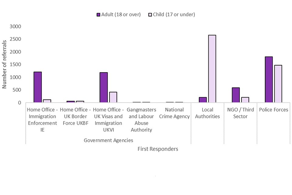 Labour exploitation accounted for 21% (2,241) of all referrals and was the most commonly reported type for adult potential victims (32%; 1,622); most of those (90%; 1,464) were male. For both adult and child potential victims, most referrals for sexual exploitation (90% and 85% respectively) were for female potential victims.