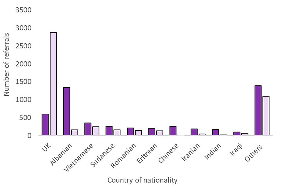 Please note, a change to data recording from 1 October 2019 means that NRM data reflects the dual nationality of potential victims in separate categories. To see total counts of a particular nationality, please refer to the data tables. A potential victim’s nationality is based on information provided by the first responder upon referral, however case workers may update this as further information is gathered.