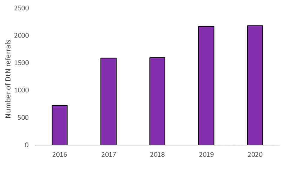 During 2020, the DtN process referred 2,178 adults to the Home Office, a similar figure to 2019.