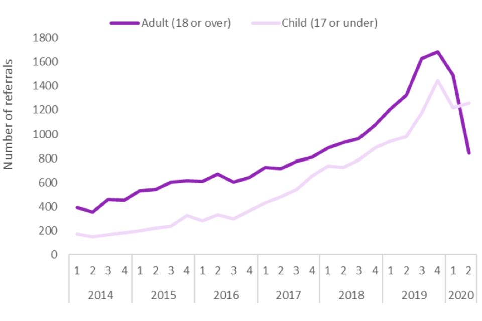3.2 Figure 1: Number of quarterly NRM referrals by age group of exploitation, 2014 to 2020