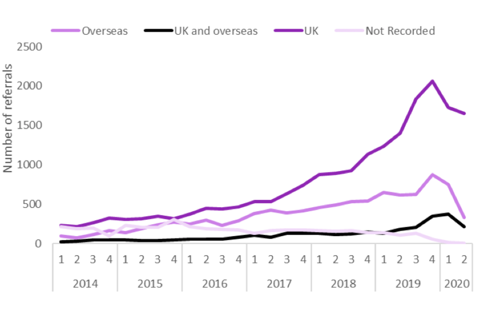 3.4 Figure 2: Number of quarterly NRM referrals by location of exploitation, 2014 to 2020