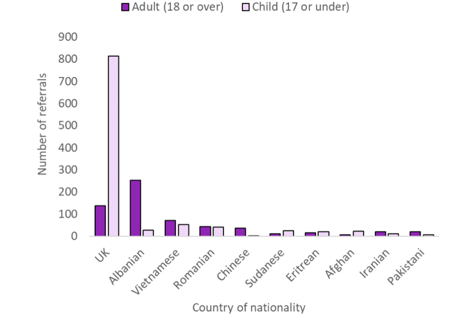The most common nationality referred were UK nationals, which accounted for 44% (977) of all potential victims (compared to 26% in the previous quarter). A large proportion of these referrals were made for child potential victims (Figure 5). The second most commonly referred nationality was Albanian (14%; 304). The majority (83%; 813) of referrals for UK nationals were for child potential victims, whilst for Albanian nationals, the majority (83%; 253) were for adult potential victims (Figure 5).