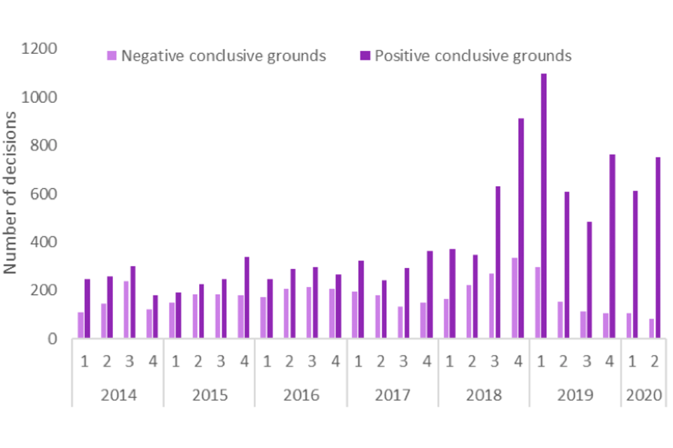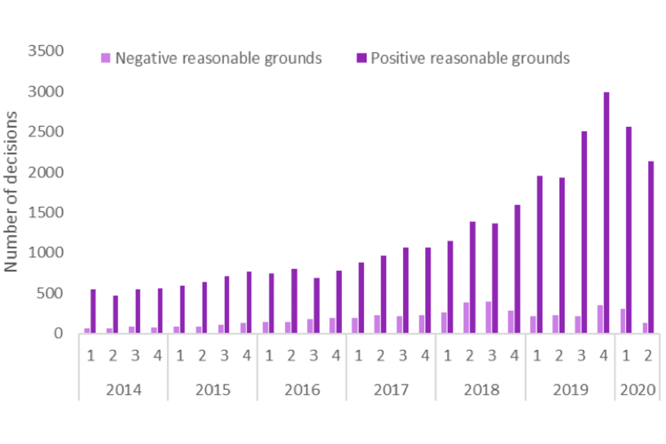 The Single Competent Authority made 2,270 reasonable grounds and 833 conclusive grounds decisions in this quarter. Of these, 94% (2,136) of reasonable grounds and 90% (750) of conclusive grounds decisions were positive.