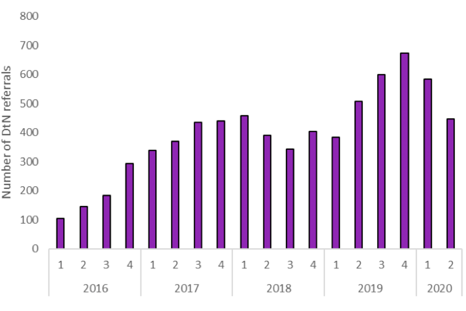 Notes: Potential victims may be reported via DtN and subsequently also be referred to the NRM at a later point in time, so these figures should not be combined due to potential double counting.