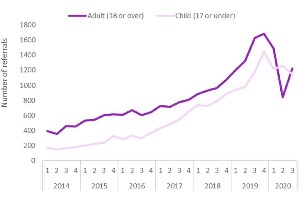 In the third quarter of 2020, the NRM received 2,500 referrals of potential victims of modern slavery. This represents a 13% increase in referrals compared to the preceding quarter (2,207) and a 11% decrease from quarter 3 in 2019 (2,806). This is the first quarter-on-quarter increase in the number of referrals since the beginning of the COVID-19 pandemic (data table 1), driven primarily by an increase in the number of referrals for adult potential victims and referrals for those exploited overseas.