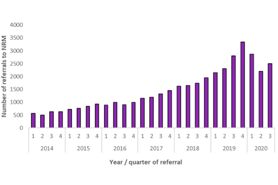 In quarter 3 2020, 2,500 potential victims of modern slavery were referred to the NRM; a 13% increase from the preceding quarter, but a 11% decrease from quarter 3 in 2019.