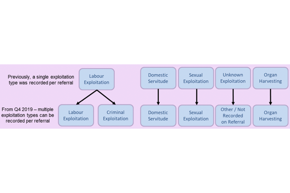Prior to 1 October 2019, potential victims of modern slavery were recorded as having a single primary exploitation type, grouped into five distinct categories: labour, sexual, domestic servitude, organ harvesting or unknown exploitation (Figure 3). Following changes to the way NRM data are collected, recording of exploitation types has changed to give a better picture of the exploitation experienced by potential victims. As a result, for referrals received from 1 October 2019, criminal exploitation has been split from labour exploitation. In addition, potential victims can also be recorded as experiencing multiple exploitation types and, as such, caution should be taken when comparing exploitation type statistics from quarter 4 with previous quarters, as the primary exploitation type is unknown. Furthermore, some breakdowns provided in previous statistical releases by certain characteristics and exploitation type have not been provided in the data tables to avoid comparisons with previous quarters.