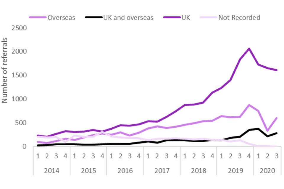 Quarterly NRM referrals for potential victims exploited in the UK only and overseas only increased from 2014 to 2019, though both fell in the first half of 2020 (Figure 2). In quarter 3, referrals for overseas exploitation increased, accounting for 24% (603) of referrals in this quarter, whilst 64% (1,610) of potential victims claimed exploitation in the UK only, compared to 75% in the last quarter (data table 2; Figure 2). Referrals of potential victims who claimed exploitation both in the UK and overseas (11%; 286) also increased compared to the previous quarter.