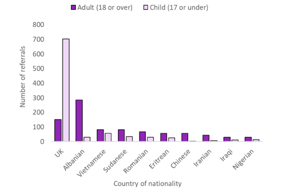 Please note that a change to data recording means that as of 1 October 2019 the dual nationality of potential victims is reflected in NRM data in separate categories. To see total counts of a particular nationality, please refer to the reference tables.