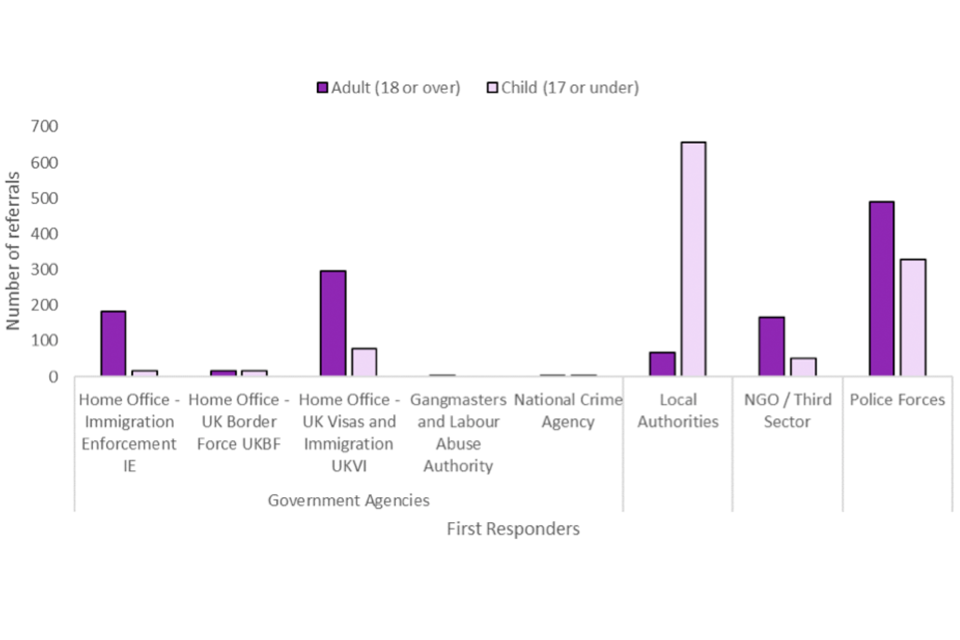 Notes: Authorised First Responder organisations include local authorities, specified NGOs, police forces and specified government agencies. Excludes potential victims with an unknown age at exploitation.