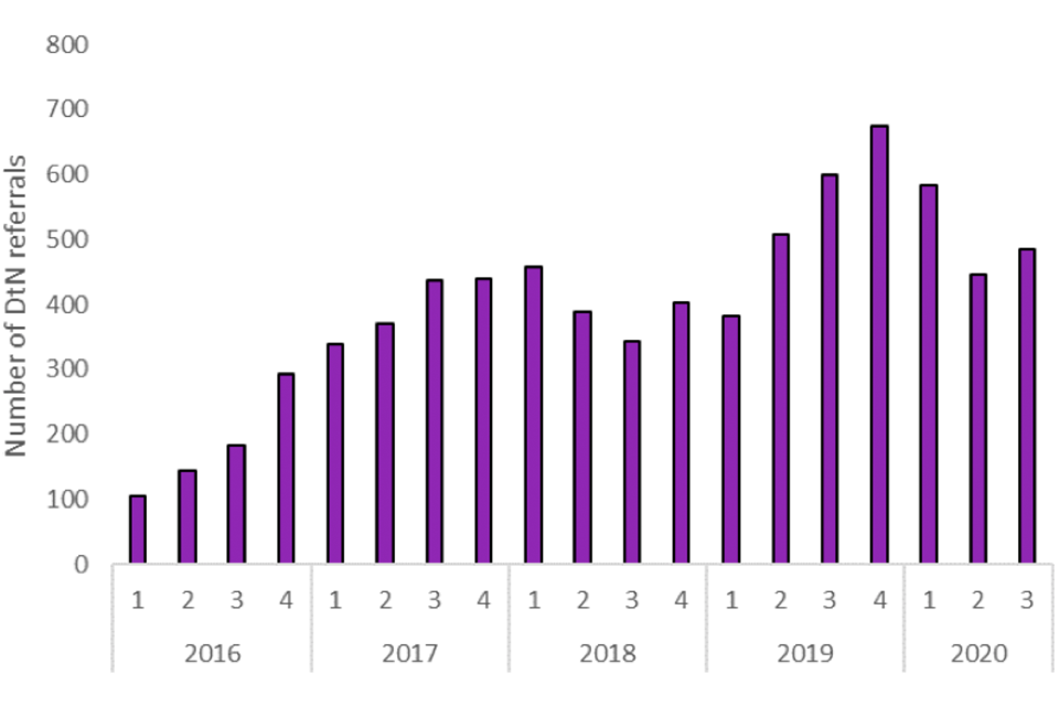 Number of quarterly NRM referrals from 2014 to 2020