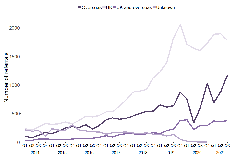 Figure 3: Number of quarterly NRM referrals by location of exploitation