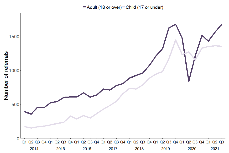 - the number of referrals received this quarter is the second highest since the NRM began in 2009 (the highest number was 3,343 in quarter 4 2019)