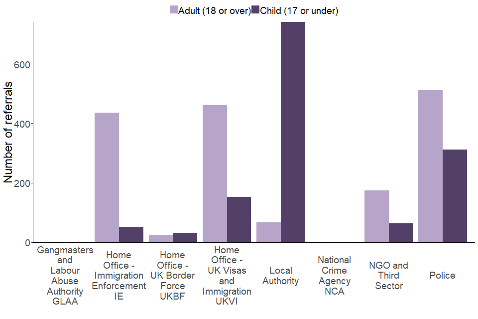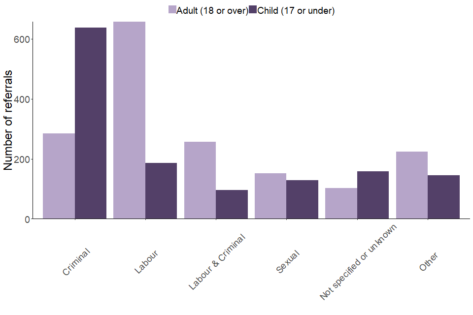 - for adult potential victims, labour exploitation was most commonly reported (39%; 657), whereas child potential victims were most often referred for criminal exploitation (47%; 638)