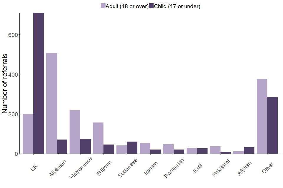 Please note, a change to data recording from 1 October 2019 means that NRM data reflects the dual nationality of potential victims in separate categories. To see total counts of a particular nationality, please refer to the data tables. A potential victim’s nationality is based on information provided by the first responder upon referral; however case workers may update this as further information is gathered.