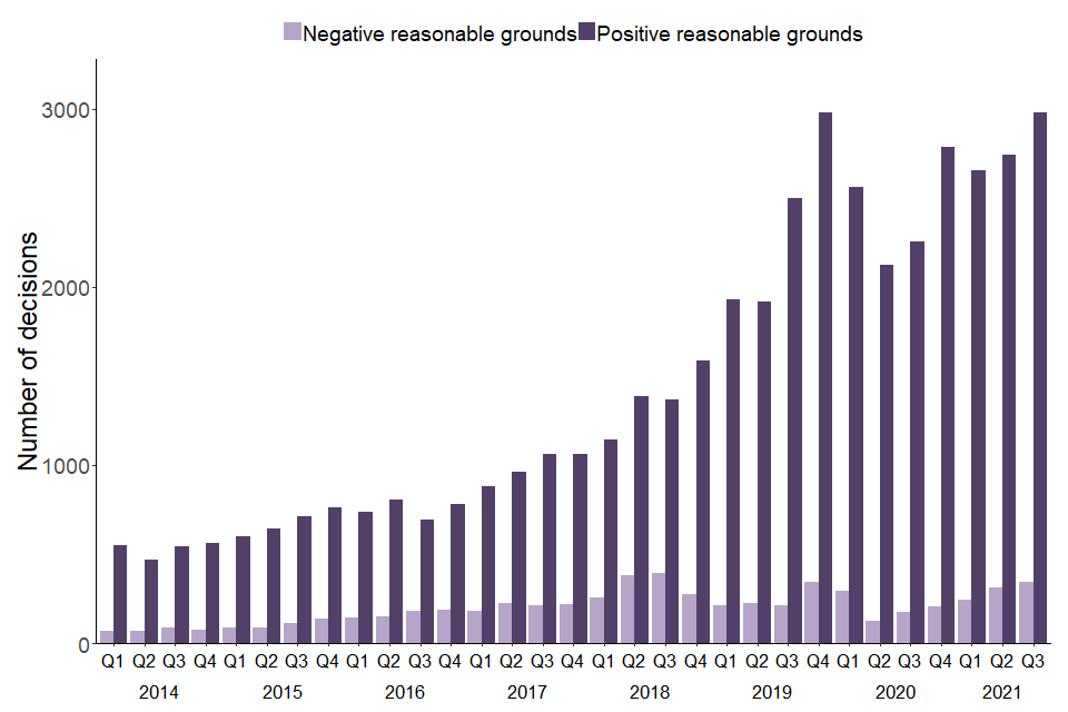 The SCA issued 3,323 reasonable grounds decisions in quarter 3 2021. Of these decisions, 90% (2,978) were positive and 10% (345) were negative. The proportion of positive reasonable grounds decisions was 89% for adult and 91% for child potential victims (data table 15). The proportion of positive decisions has remained relatively similar in recent years, with around nine out of every ten referrals receiving a positive decision.