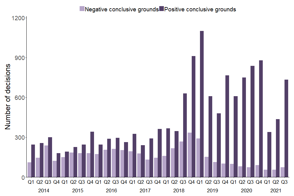 In quarter 3, the SCA issued 808 conclusive grounds decisions, compared to 492 in the previous quarter and 912 in the same quarter of the previous year. Of the decisions issued this quarter, 91% (733) were positive and 9% (75) were negative. The proportion of positive conclusive grounds decisions was 88% for adult and 94% for child potential victims (data table 16). The number of conclusive grounds decisions issued has been increasing over the course of 2021 as a result of the recruitment of additional decision makers by the SCA.