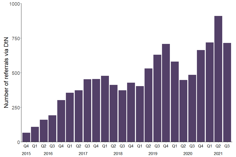 Notes(s): Potential victims may be reported via DtN and subsequently also referred to the NRM at a later point in time, so these figures should not be combined due to potential double counting.
