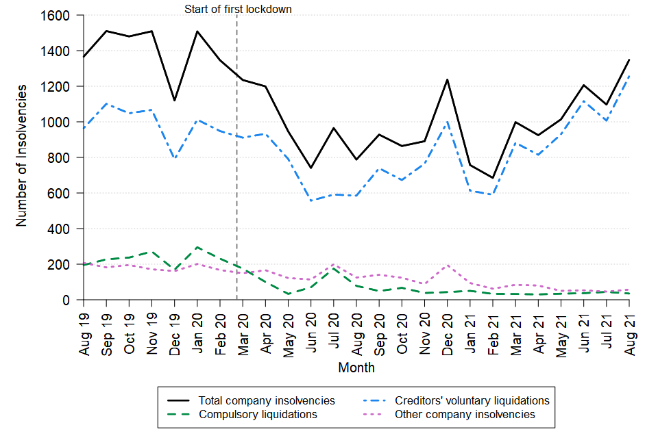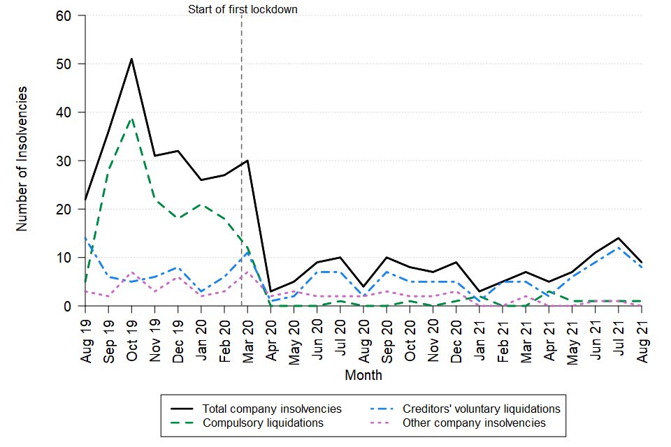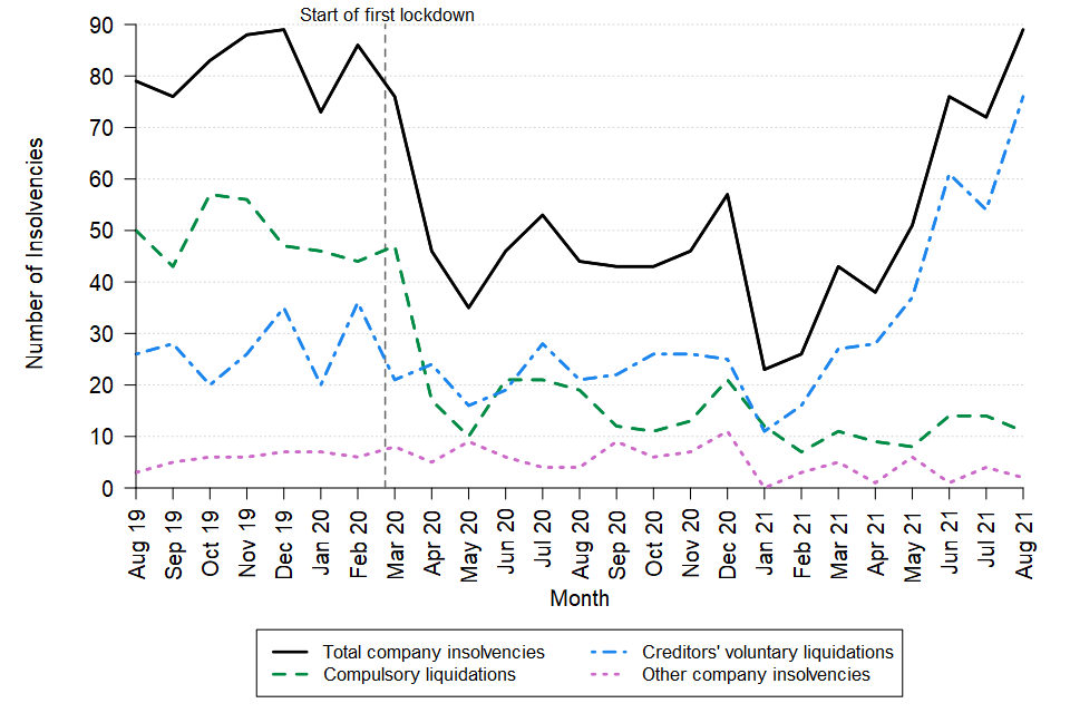 Figure 5: In August 2021, the number of registered company insolvencies was similar to pre-pandemic levels
