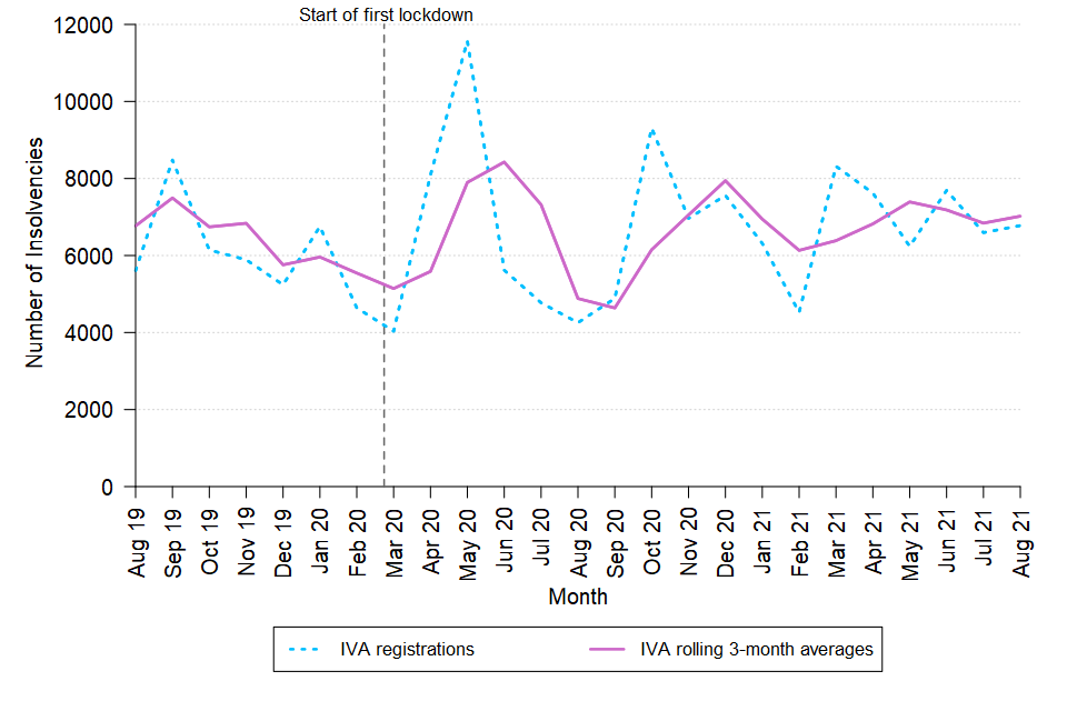 IVA registrations presented in Figure 3 are the numbers of registrations with the Insolvency Service in each month. The rolling three-month averages presented are mean average number of registered IVAs in the three months ending in the reference period. For example, the three-month rolling average estimate for August 2021 is the calculated mean average of the total IVA registrations during June, July and August 2021.